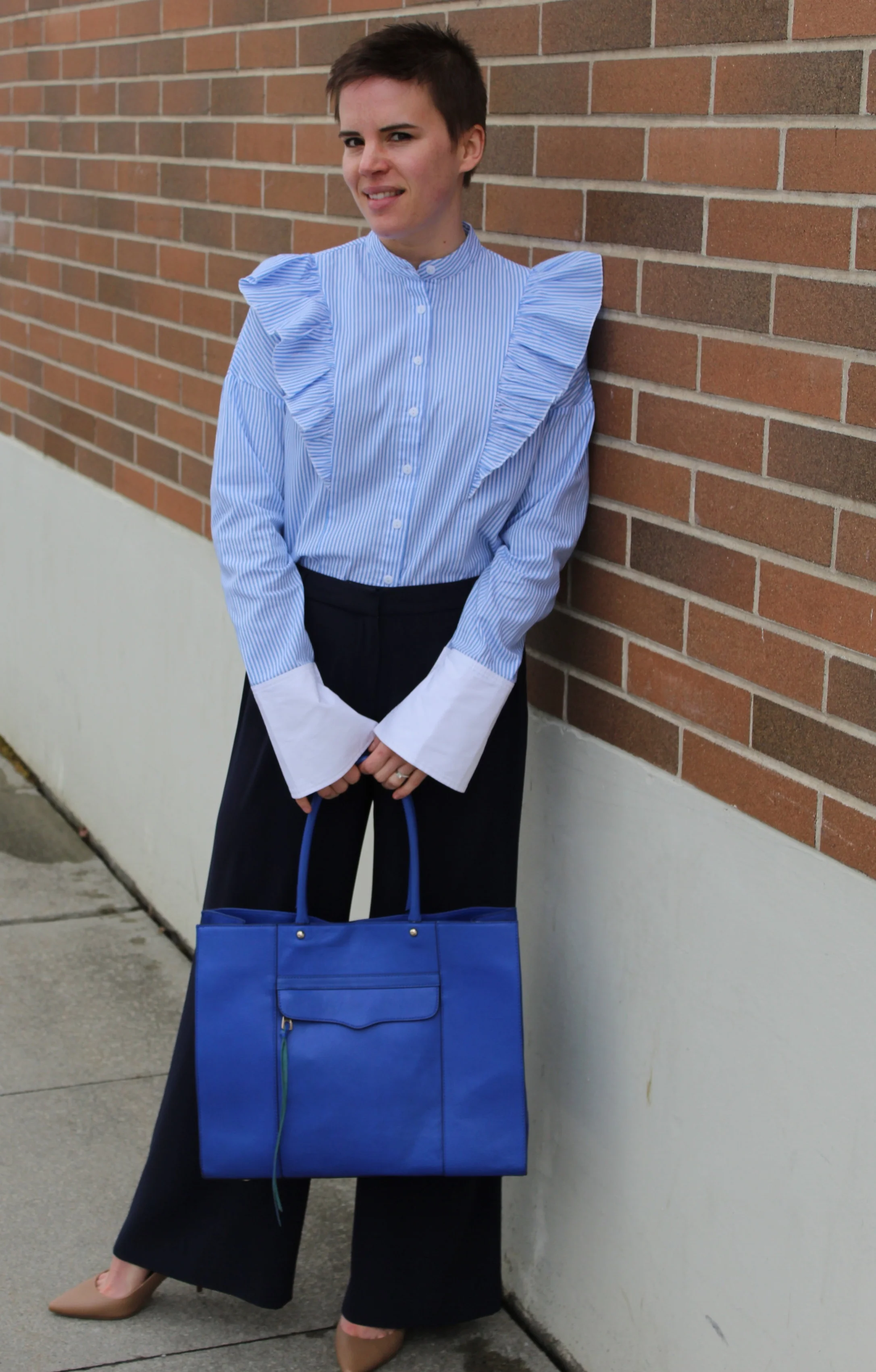 Claire recently took the statement sleeve plunge and purchased a ruffle blouse with contrast cuffs. She opted for a cotton button-up that she could dress up with slacks and pumps for an office-appropriate outfit, but can also pair with a leather mini and booties for an evening out.